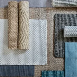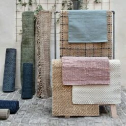 Stylish hand-woven minimalist jut mat. There are several colors. Vacuum or shake. Don’t tolerate soaking. For indoor use only.